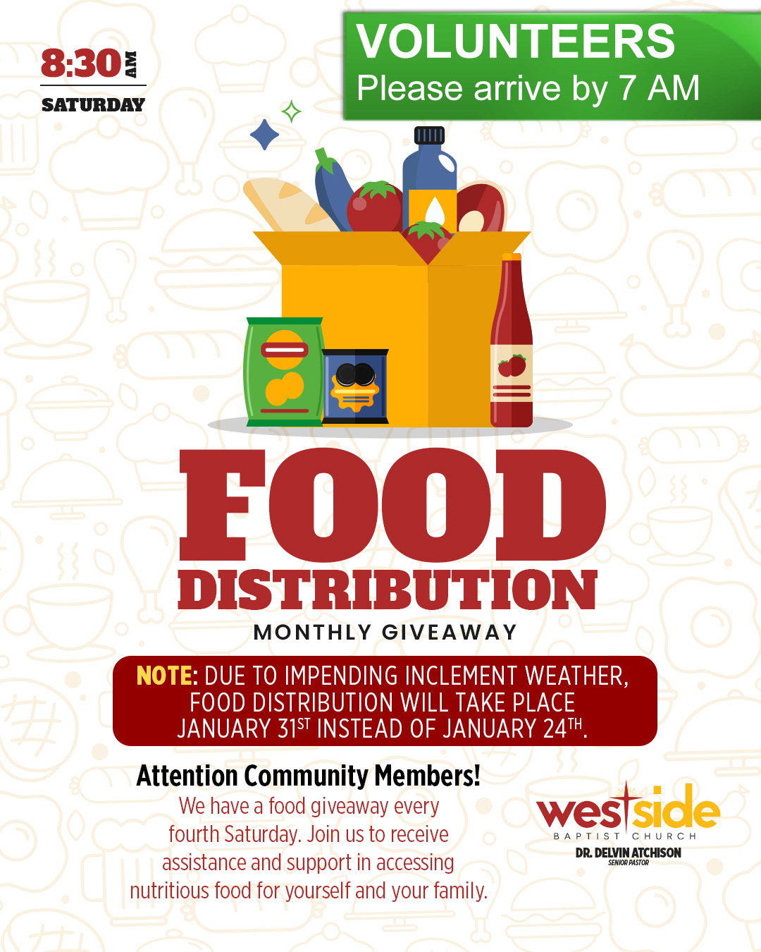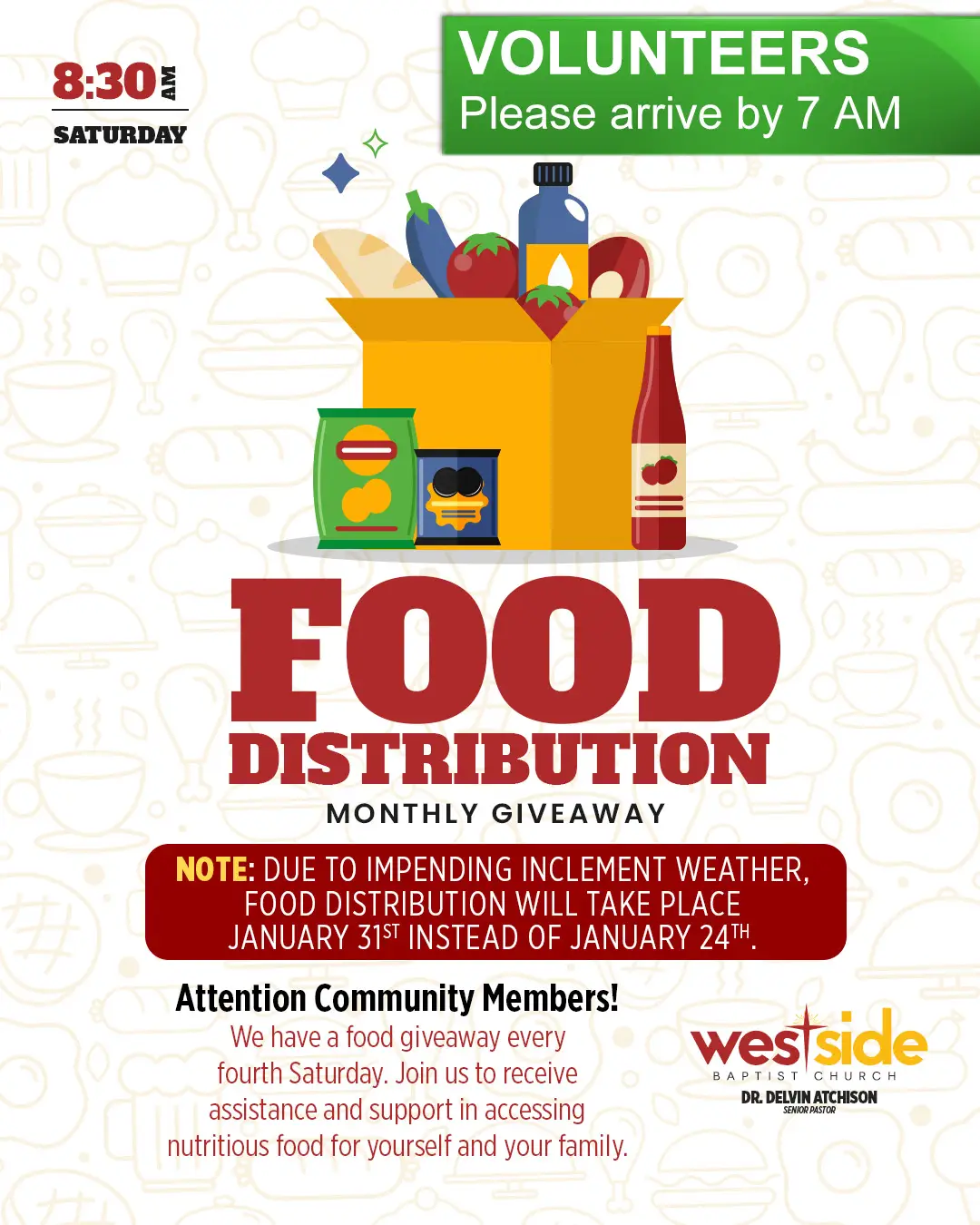 THE FOOD DISTRIBUTION FOR JANUARY 24TH HAS BEEN POSTPONED AND WILL TAKE PLACE ON JANUARY 31ST