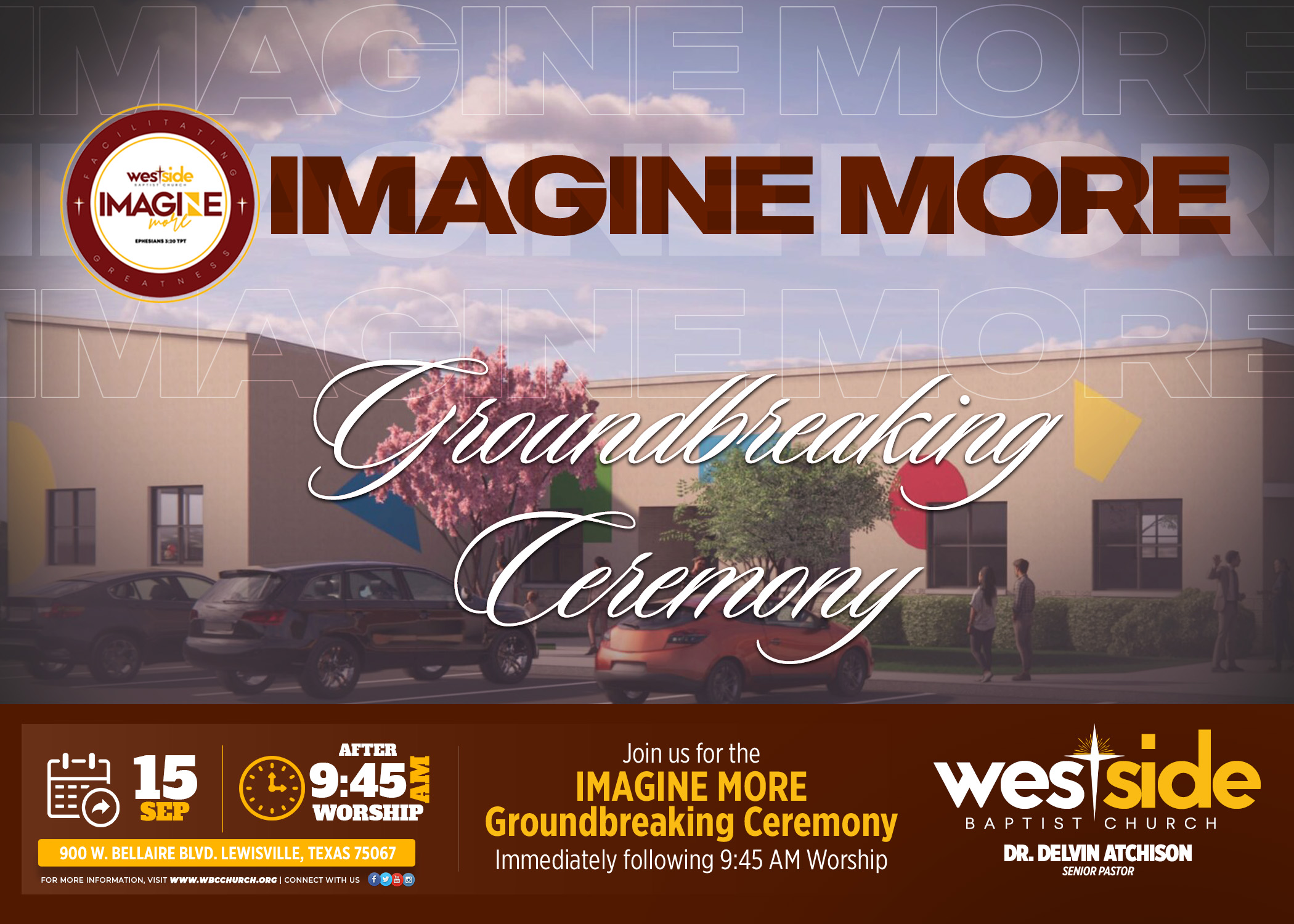 Organizer Admin / Church Staff Date Sep 15 2024 Expired! Time 11:30 am Imagine More Groundbreaking Join us for theImagine More Groundbreaking Ceremonyimmediately following 9:45 AM Worship + Add to Google Calendar + iCal / Outlook export