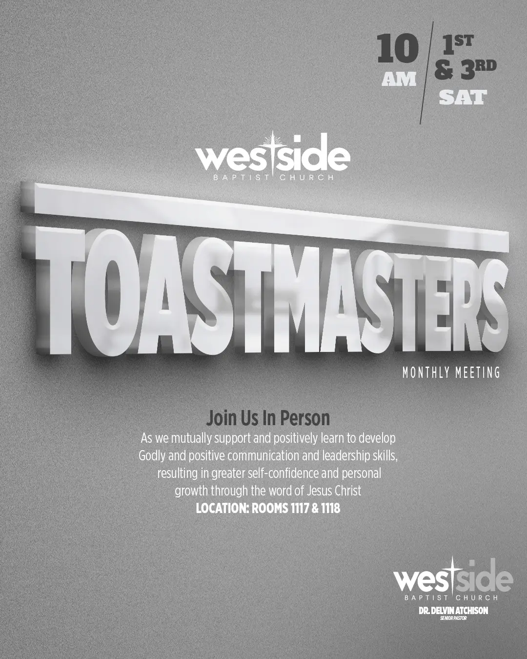 Organizer WBC Toastmasters Website http://wbcchurch.org/ministry/toastmasters/ Date Jul 18 2026 Time 9:30 am - 10:30 am WBC Toastmasters Meeting 1st & 3rd SaturdaysIn Person (Rooms 1117 & 1118)9:45am – 11am CT + Add to Google Calendar + iCal / Outlook export